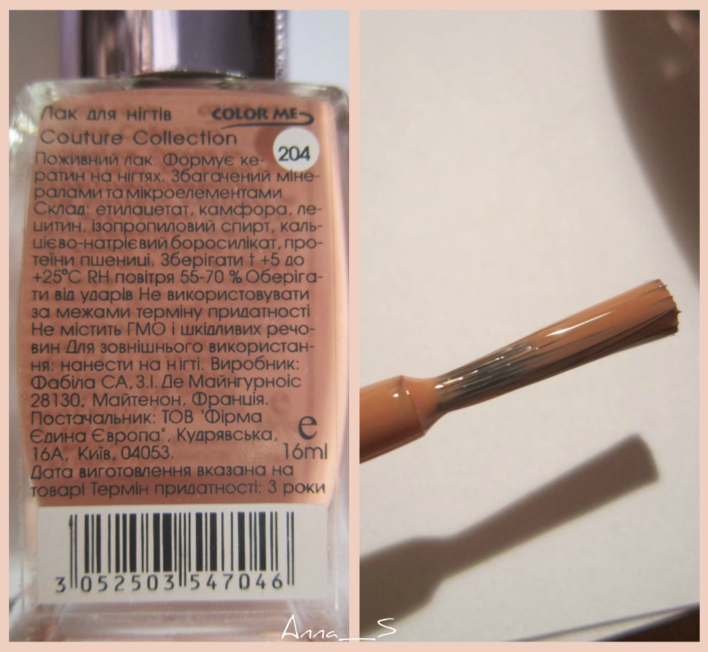 Информация от производителя: "Декоративные лаки ухаживают за ногтями, предупреждая расслаивание и укрепляя их. Питательный лак Color Me Couture Collection обогащен витаминами и минералами, такими полезными для пластины ногтей.