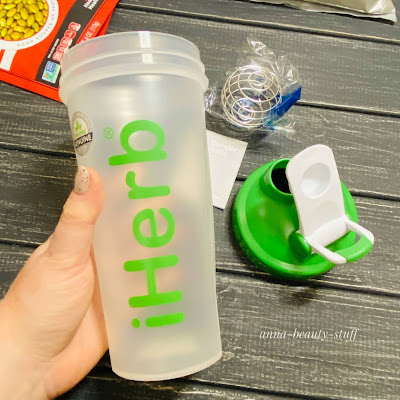 iHerb Goods, бутылка-шейкер с шариком для смешивания, 600 мл. Товар из раздела пробников, ссылка будет ниже. Крышка надежно закручивается, клапан для питья защелкивается очень плотно. Есть петелька для крепления к сумке/поясу/велику. На корпусе есть шкала с миллилитрами и унциями. Запаха пластика нет. Удобная по форме, хороший шарик-пружинка для смешивания и взбивания. Можно делать тесто на оладушки/панкейки, коктейли, смешивать протеин. Мне великовата, т.к. пью растительный протеин с 250 мл натурального йогурта и просто размажу смесь по стенкам. А вот если смешивать молочный протеин с более жидкими напитками в бОльшем количестве - будет идеально.
